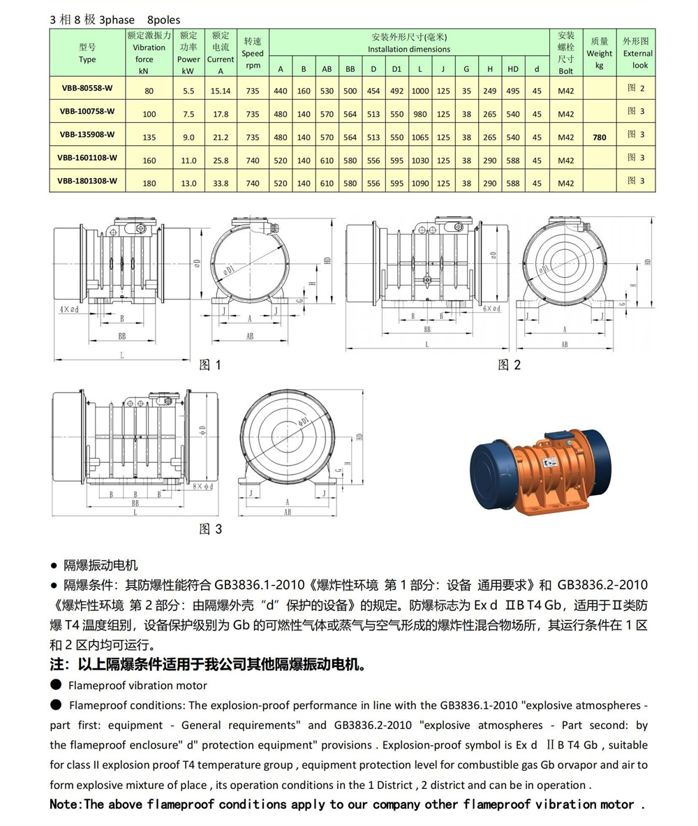 VBB系列隔爆型振动电机是运用本公司VB系列振动电机成功技术,综合国内外隔爆的先进技术,将隔爆技术与振动技术相结合,专为油田固控设备而设计的产品,外壳防护等级为IP55,绝缘等级为F级,防爆标志为ExdⅡBT4,适用于Ⅱ类T4组别可燃性气体或蒸汽与空气形成的爆炸性混合物的场所,在油田泥浆分离筛、除泥器、除砂器等设备上已被广泛使用。其技术水平与当今世界先进水平相当,主要性能参数达到世界先进水平,在国内处于领先水平。此系列石油专用隔爆型振动电机规格齐全,覆盖市场范围广,如大庆油田、胜利油田、濮阳油田、土哈油田、玉门油田、长庆油田、辽河油田、大港油田、克拉玛依油田等。由于性能可靠、供货及时、服务迅速、价格低廉,尤其是价格低于同类产品的1/4,在国内市场占70%。VBB系列振动电机正逐步替代进口产品。